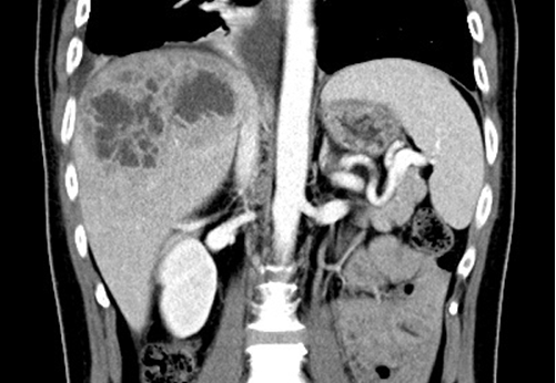 上圖:患者的影像醫學檢查可發現肝臟有嚴重膿瘍